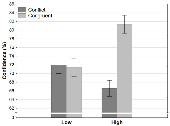 Finally, the ANOVA of confidence judgments resulted in the same pattern. The large interaction effect was significant because there was no difference between the low-level conditions, while participants were much more confident in the high-congruence and much less confident in the high-conflict condition (Figure 5).