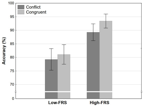 Accuracy as a function of congruence and final response strength level in Experiment 2 (error bars represent 95% CI). FRS refers to the final response strength level (see Table 1).