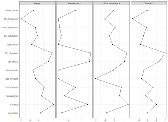 Descriptively, we report in Figure 2 the results for the four indices explained in the statistical analysis section. As evident from the plots, SRL strategies, curiosity, and self-efficacy are constantly the three most influential nodes in the network. Fluid reasoning, on the contrary, has a small impact on this network. Nonetheless, it is one of the two direct predictors of academic achievement. Interestingly, the other two soft skills (i.e., adaptability and curiosity) are placed on the border of the model and their centrality indices are quite low, highlighting that their specificity only affects part of the network.