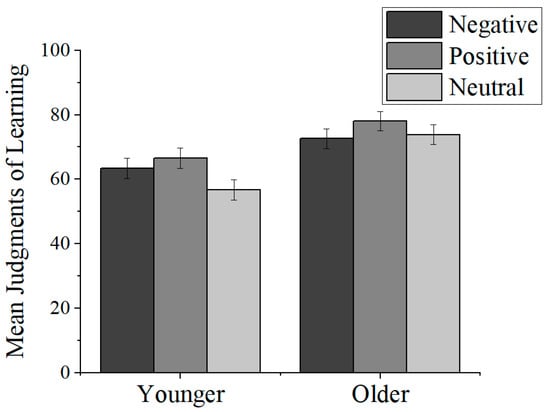 According to socioemotional selectivity theory, as people age, the goal of focusing on emotional well-being and emotionally meaningful aspects of life becomes prioritized (; ). That is, younger adults tend to focus equally or more on negative and positive experiences, while older adults focus more on positive experiences (; ). This leads to a “positivity effect (PE)” in older adults’ cognitive processes that prefers positive stimuli (), and this positivity bias may be an important cue in their JOLs. This positivity effect in older adults should also be reflected in metacognitive judgments: that is, older adults should have higher JOLs for positive stimuli than for negative and neutral stimuli (; ). () found PEs for older adults’ JOLs by having older adults study negative, positive, and neutral words, making JOLs after learning each word, and then being asked to take a recognition memory test. The results found that older adults made higher JOLs for positive words than for both negative and neutral words, while there was no significant difference in JOLs for negative and neutral words. This is consistent with the socioemotional selectivity theory indicating that individuals have age-related differences in emotional bias, suggesting that this positivity bias may be a cue for older adults to make JOLs.
