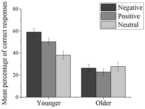 This paper aims to further clarify the role played by emotion in the metacognition of younger and older adults and to fill the gaps in previous studies. The present study investigated the effect of the interaction of emotion and age on JOLs and its accuracy when participants studied positive, negative, and neutral pictures after making JOLs in a recognition task in which the learning material also contained negative pictures. If the emotional salience effect of JOLs in older adults is the same as in younger adults because pictures are more pronounced for emotional stimulus characteristics (), then the emotionally salient effect in older adults should also be observed in the memory task containing negative pictures in the present study, i.e., JOLs for emotional pictures would be higher than JOLs for neutral pictures in line with younger adults. Moreover, () selected only positive and neutral pictures and lacked negative pictures, so the phenomenon of positive JOLs higher than neutral JOLs may have different meanings in different age groups. For younger adults, it means an emotional salience effect, while for older adults, it may indicate a PE in socioemotional selectivity theory (). In the recognition task, then, we predicted that the results of the present study should be consistent with those of (). That is, younger adults’ JOLs would show an emotional salience effect (emotional JOLs would be higher than neutral JOLs), whereas older adults would reflect the PE, that is, positive JOLs would be higher than negative JOLs and neutral JOLs.