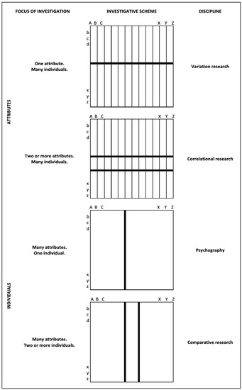 In 1911, Stern published his second book on differential psychology: Die Differentielle Psychologie in ihren methodischen Grundlagen (Methodological Foundations of Differential Psychology). This was not simply a new edition, but an extension of his program. The 1911 version of differential psychology is illustrated in Figure 1. In Stern’s theorizing, differential psychology was the collection of four methods with two different orientations for research. As we have seen, the first two—variation research and correlational research—had already been established in the first version of the program, and both focused on attributes through the study of many individuals. Variation research focused on individual differences in a single trait, whereas correlational research focused on the covariance patterns between at least two traits. The latter conceptually covers the factorial studies of the structure of abilities and other kinds of multivariate analysis. In its 1900 version, only these two methods, variation and correlation research, constituted the approach.