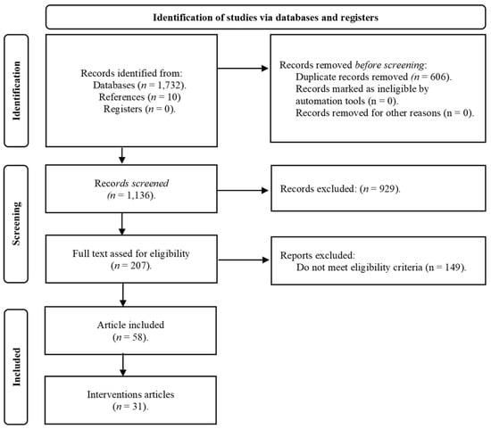 A total of 1732 articles were identified, and after eliminating the duplicates and applying the eligibility criteria, 58 articles were selected for analysis (Figure 1).