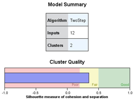 The summary of the model (Figure 1) shows the configuration of two clusters with the entry of 12 variables: 4 categorical variables (sex of the teacher, educational stage, ownership of the school, and years of teaching experience in the educational institution) and the 8 numerical variables that coincide with the dimensions of the questionnaire, since the dimension involvement in the parents’ associations and in the school council of the school was split into two. Regarding the quality of the clusters, this same figure indicates that the result is in the “Sufficient” zone, which, according to (), is fair but acceptable evidence of the structure of the clusters obtained.