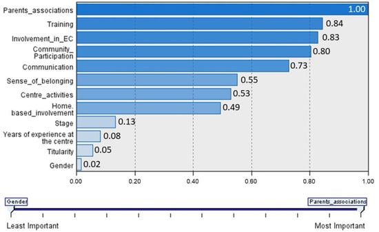 The importance of each variable selected to configure the teacher profiles is reflected in Figure 2. As can be seen, the most important predictor for this configuration is the dimension related to the teacher’s facilitation of family involvement in the school’s parents’ associations, followed by the rest of the dimensions included in the questionnaire. The variables stage, experience at the school, ownership of the school, and sex appear as the socio-demographic variables that are important in the configuration of the profiles, although less so than the aforementioned dimensions.