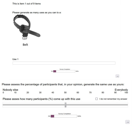 In both re-analyzed experiments, participants completed the AUT in two conditions to which participants were randomly assigned. The instructions used a picture of a brick to demonstrate the task and the user interface for entering each use idea. The idea elicitation phrasing was: “Please come up with as many uses as you can think of for a brick.” Accompanied by a picture of a brick. Assessing originality was elicited with the following: “Please assess how many participants (%) came up with this use” with a continuous scale, with captions of “Nobody else” near the 0%, and “Everybody” near the 100%. Participants could produce as many ideas as they wished. Notably, a request to be original was not mentioned.