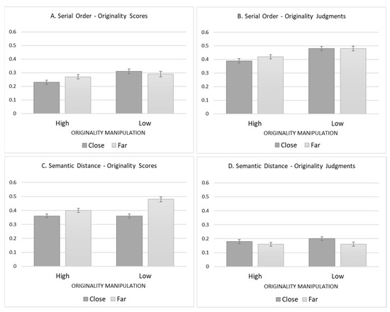 Next, we analyzed the effects of the 2 × 2 manipulations on β for each cue separately. This was performed to examine the effect of the manipulations on the predictive power of each of the cues on originality scores and originality judgments. These regression analyses revealed several main effects and interaction effects (Table 3). As explained in our hypotheses above, the main finding is the mere existence of interactions between the two manipulations. These interactions indicate the separability and unique contribution of semantic distance manipulation on top of the effects of the originality manipulation. This finding goes beyond the effects on the means of originality scores. Interestingly, we see an effect of the originality manipulation: a higher overall serial order β (regardless of distance manipulation) of originality judgments; a higher originality score β in the far semantic distance manipulation than all others.