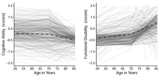 The observed average trajectory of general fluid cognition was consistent with previous evidence showing that individual differences in changes in fluid abilities are detectable earlier in the lifespan (i.e., before/during middle age) than changes in crystallized abilities (i.e., vocabulary), and that cognitive declines accelerate in later life (Baltes et al. 2006; Schaie 2005). Prior studies of functional limitation similarly provide evidence of age-related linear worsening, especially in motor skills and muscle strength (Hall et al. 2017; Liao and Chang 2020).