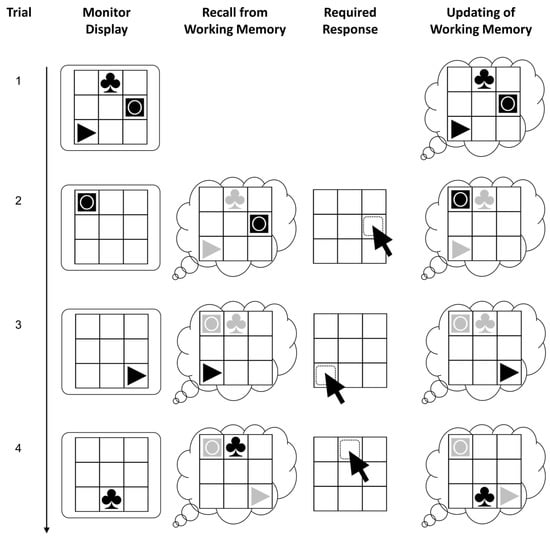 The capacity of working memory was assessed using a Recall-N-Back paradigm with figural stimuli (see Figure 2) that has been used in previous research (e.g., Schmitz and Wilhelm 2016; Wilhelm et al. 2013). The task requires to update stimulus-location bindings across blocks of trials. Each block started with the presentation of a 3 × 3 grid with one to four simple figures, each in a different cell. After the stimuli disappeared, one figure was shown for the fixed duration of 4000 ms in one of the cells in each trial. Participants were instructed to indicate by mouse-click in which of the cells the currently shown figure had been presented the last time. Then they had to update the new position of that stimulus so they could recall it when shown the next time. Responses were possible only during the fixed presentation interval; however, its sufficiently long duration did not require particularly speedy responding. After giving a response, the stimulus was removed and only the grid was visible for an inter-stimulus interval of 500 ms.