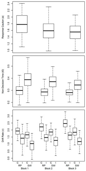 Boxplots of diffusion model (DM) parameters. Upper panel: response caution split by block; middle panel: non-decision time, split by block and task repeat (RP)/switch (SW) trials; lower panel: drift rates, split by block, task repeat (RP)/switch (SW) and response congruent (C)/incongruent (I) trials.