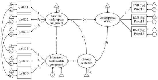 As a baseline condition, we used response–congruent task-repeat trials. The increased processing requirements of a task switch were modeled using task-switch trials with congruent response mappings to derive a pure estimate of the task-switching effect. Analogously, effects of response incongruency were modeled by using response–incongruent trials from task-repeat trials to estimate the pure effect of response incongruency. The latent mean difference and the relations of the baseline condition and the reliable increment with WMC were tested simultaneously for each diffusion model parameter and performance score. As there was only one indicator task also for WMC, three parcels were built with comparable requirements in terms of load and updating, so that the indicators would be parallel in terms of difficulty and discrimination. Parceling was chosen to derive a parsimonious measurement model (given the only moderate sample size) and because we were not interested in the measurement of visuospatial WMC itself but in its latent relations (see Little et al. 2013).