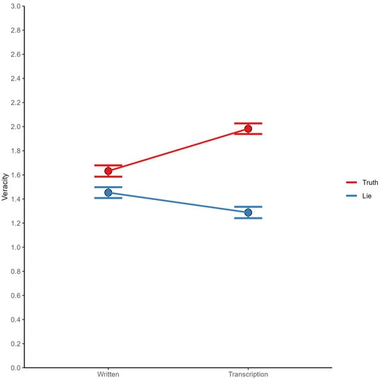 Our study focused on veracity ratings, which were measured on a four-point ordinal scale. As this variable represents an ordinal level of measurement, we conducted an ordinal logistic regression analysis to investigate the impact of cognitive measures on lie veracity. Four predictors were used: Raven’s Progressive Matrices score (RAPM), verbal fluency index (VFI), N-back task, and task switching (TS). To account for the substantial interaction between modality and statement status, F(1,321) = 61.30, p < .001, and = .031, we decided to run separate analyses for written and transcribed statements. Our findings revealed that truthful statements were perceived as more credible when they were transcribed than when they were written. Conversely, written statements were rated as more truthful than transcriptions for falsehoods (see Figure 1).