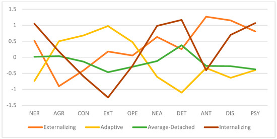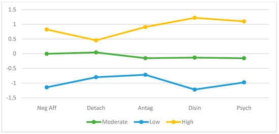 Figure 3 shows a visual depiction of the means across profiles. The Externalizing profile members (21.5% of respondents; 46.3% male, 53.7% female) were between the ages of 20 to 56 (M = 32.31; SD = 10.37) and labeled accordingly based on the lowest scores in agreeableness and highest scores in antagonism and disinhibition. The Adaptive profile (28.2% of respondents, 45.5% male, 54.5% female) between the ages of 19 and 71 (M = 39.67; SD = 12.86) has the lowest neuroticism, negative affectivity, detachment, antagonism, disinhibition, and psychoticism while exhibiting the highest agreeableness, conscientiousness, extraversion, and openness to experience compared to its counterparts. The Average-Detached profile (40% of respondents, 57.7% male, 42.3% female) was between the ages of 18 to 73 (M = 43.27; SD = 13.99) and shows moderate scores across all domains with the lowest scores in openness to experience (tied with Internalizing-Thought disorder profile) and psychoticism (tied with the Adaptive profile). The Average-Detached profile was labelled as such given its maxima is in the detachment domain. The Internalizing-Thought disorder profile (10.3% of respondents, 35% male, 65% female) between the ages of 18 to 73 (M = 43.27; SD = 13.99) had the lowest extraversion and openness to experience and highest neuroticism, negative affectivity, detachment, and psychoticism compared to other profiles. In this latent profile analysis, the most important variable is detachment as evinced with the largest effect size and VS-MPR (ηp2 = 0.61; VS-MPR = 4.55 × 10 + 34), reflecting larger differences between profile memberships. The least important variable is openness-to-experience, with the smallest effect size and VS-MPR (ηp2 = 0.09; VS-MPR = 88.35). Appendix A shows details of these analyses.