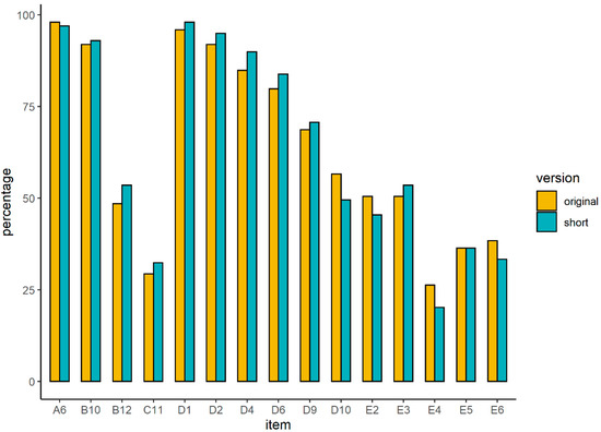 Percentage correct on original and short version items. Note: We only depicted items from the original version that were also administered in the short version. We tested per item whether item-performance differed between versions using a series of logistic regressions. Results indicated that performance on all items was similar across versions (SOM Table S6).