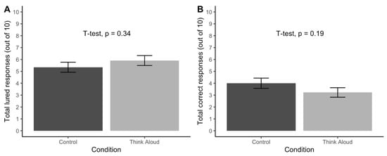 Thinking aloud did not impact performance. Figure 1 affirms our pre-registered hypothesis and prior meta-analytic work (): we did not detect an interference effect of thinking aloud on the number of lured or correct responses on the vCRT.