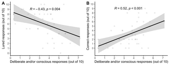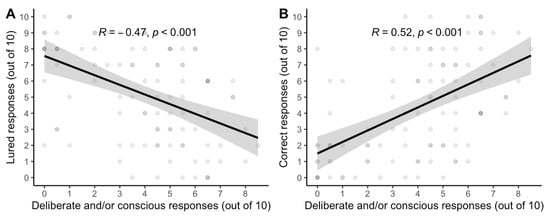 Correlations between the “two-factor” coding of reflective responses (deliberate and/or conscious) and (A) the number of lured—or so-called “unreflective”—responses and (B) the number of correct—or so-called “reflective”—responses on the verbal reflection test (vCRT) performance in Study 2 (N = 102). Gray bands represent a standard error.