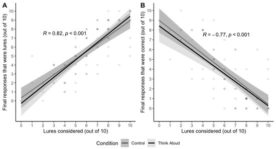 Correlations between the “two-factor” coding of reflective responses (deliberate and/or conscious) and (A) the number of lured—or so-called “unreflective”—responses and (B) the number of correct—or so-called “reflective”—responses on the verbal reflection test (vCRT) in the think-aloud condition of Study 1 (N = 47) with gray standard error bands.
