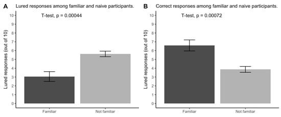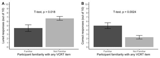 The number of (A) lured responses and (B) correct responses on the verbal reflection test (vCRT) among participants in Study 2 (N = 102) depending on their unsolicited self-report of familiarity with the vCRT. Error bars represent a standard error.