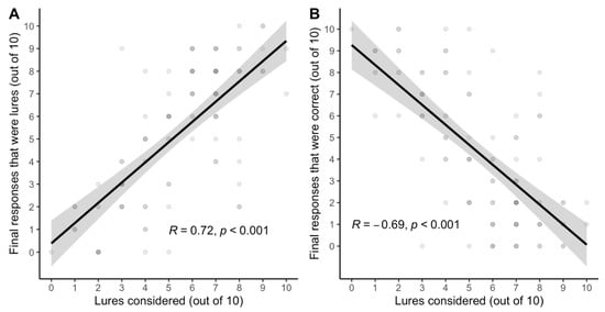 Correlations between consideration of lures and (A) acceptance of lures and (B) acceptance of correct responses on the verbal reflection test (vCRT) in Study 1 (N = 99). Gray bands represent a standard error.