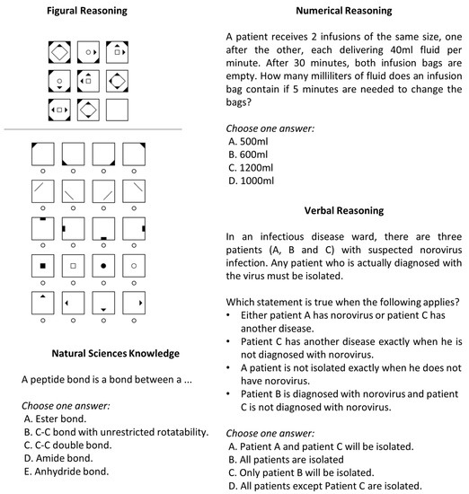 The verbal reasoning task comprised 16 items including text-based premises. Test takers had to compare and analyze the given relations to answer a corresponding question. The response format was identical to that of the numerical reasoning test. Items within each reasoning subtest were presented in ascending order of difficulty. Numerical and verbal reasoning tasks were contextualized for a medical context.