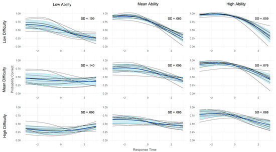 The random effects meta-analysis of the 10 figural reasoning subsamples resulted in an overall ToT effect of = −0.60 (95% CI [−0.74, −0.47], I2 = 13%; see Figure S1 (Supplementary Materials)). Fixed slope estimates were all negative with no significant heterogeneity and ranged from = −1.21 (95% CI [−1.68, −0.74]) for sample 1 to = −0.22 (95% CI [−0.68, 0.25]) for sample 9. For all samples but sample 9 (r = −.06) there was a negative correlation of the and estimates (r = −.38 to r = −.72), meaning stronger negative ToT effects for more able persons. Similarly, the item correlations r(,) were negative on average (r = −.24), meaning stronger negative ToT effects for easier items. However, the correlations were smaller and less consistent, with positive correlations for sample 2 (r = .34) and 9 (r = .14). Figure 2 shows the model implied and meta-analyzed conditional accuracy functions, split by item difficulty and person ability. Generally, as can be observed by the dark blue lines, faster answers were more likely to be correct. However, the size and direction of the relationship varied stronger as item difficulty increases and participant ability decreases. A positive overall ToT effect was even observed for participants with low abilities solving difficult tasks. Concerning replicability of the ToT effect, the black curves representing the different samples were largely comparable. Heterogeneity across samples was higher for low ability participants (SD = 0.096–0.140) as compared to mean and high ability participants (SD = 0.059–0.095).