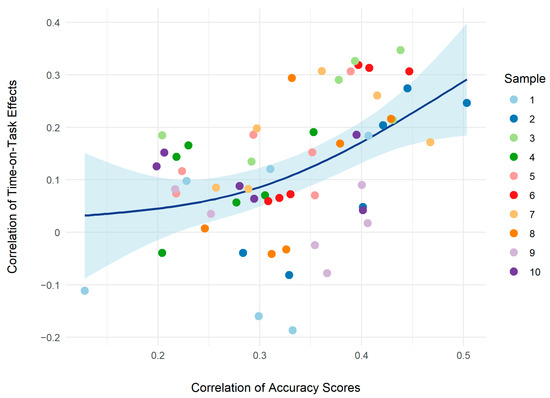 Bivariate correlations of the time on task effects as a function of bivariate ability correlations. Time on task estimates are based on separate models for each of the four cognitive ability measures times the 10 subsamples. The dark blue line represents the smoothed overall trend with its 95% confidence interval in light blue.