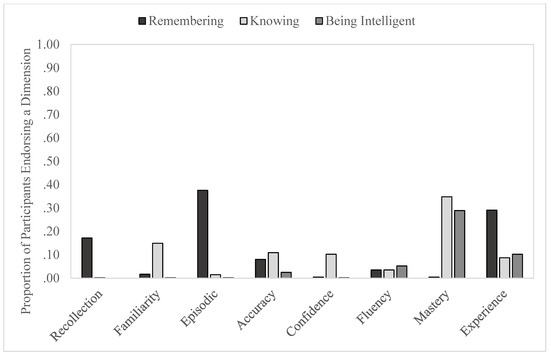 Recollection, Episodic, and Experience were the dimensions that participants mentioned the most in response to being asked about the meaning of remembering versus knowing or being intelligent. Participants referenced Recollection for remembering (M = .17) more than for knowing (M = .003) or being intelligent (M = .00), with no difference between knowing and being intelligent (p = .16). More responses included Episodic for remembering (M = .38) than for knowing (M = .02) and than for being intelligent (M = .003); the latter two did not differ. Finally, for Experience, the same pattern emerged as for Recollection. That is, participants referenced Experience for remembering (M = .29) more than for knowing (M = .09) or being intelligent (M = .10), with no difference between the latter (p = .22). Note that the patterns regarding remembering and knowing with regard to Recollection and Episodic are consistent with the findings of Umanath and Coane (2020) in which participants were asked to define what it means to say “I remember” and “I know”. Interestingly, in that previous work, Experience was more associated with “I know” than “I remember”. We address this discrepancy in the Discussion.