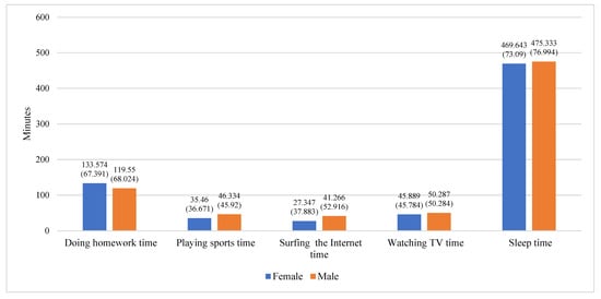 Previous literature also suggests possible gender and grade differences in time use (Lloyd et al. 2008). For instance, a survey of American adolescents showed that 8th graders spent more time watching TV and playing video games than 10th graders, and girls spent less time playing video games than boys (Tang and Patrick 2018). Twenge and Martin (2020) found significant gender differences in digital media use among American and British youth, with females spending more time on the Internet and social media, while males allocated more time to gaming and electronic devices. A study of 237 college students found that younger college students had shorter sleep time, while female college students had poorer sleep quality than males (Tsai and Li 2004). A study in Canada found that there were significant gender differences in weekend time use and that adolescents had less leisure time as their grade level increased (Hilbrecht et al. 2008).