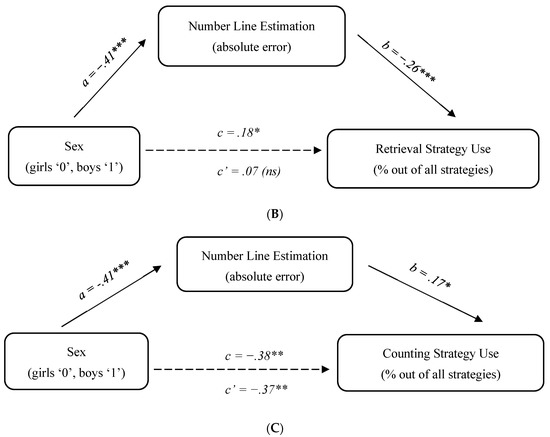 With regard to counting, the use of this strategy was characterized by sex differences; notably, they were in the opposite direction compared to decomposition and retrieval. For consistency, we tested whether there was also an indirect path between sex differences in this strategy use and the number line estimation accuracy. The results of the mediation analysis show that while there was indeed a significant direct effect of sex on counting frequency (95% CI [2.15; 30.67]), the indirect effect was not significant (95% CI [−1.16; 6.30]). In other words, a higher frequency of the counting strategy in girls, compared to boys, was not mediated by their number line estimation error (see Figure 1C).