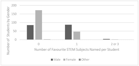 When comparing students’ gender and their enjoyment of STEM subjects, it was again evident that STEM subjects were appreciated more by boys than girls (Figure 2). Most female students (77.8%, n = 172) named no STEM subjects as their favourite, in contrast to half the male students in the sample (49.9%, n = 87) who reported that their favourite subject was from the STEM category. A chi-squared test (6, N = 399) = 39.93, p < .001 confirmed that the association between gender and enjoyment of STEM subjects was statistically significant.
