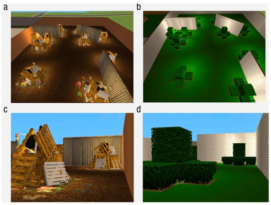 Example Scene Stimuli. From Cleary and Claxton (2018). Panels (a,b) represent a bird’s-eye view of the junkyard study scene, which spatially corresponds to the hedge garden test scene. Panels (c,d) represent the participant’s first-person perspective of these study–test pairs.
