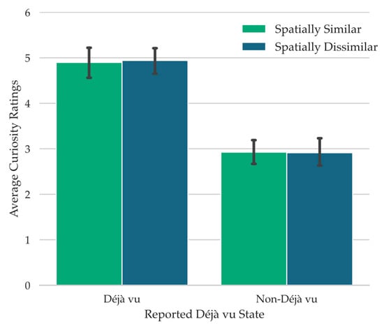 Curiosity Ratings, Spatial Similarity, and Déjà vu Reports. Average feeling of curiosity ratings as a function of spatial similarity and reported déjà vu states. Curiosity ratings were significantly higher among déjà vu reports compared to non-déjà vu reports; however, there was no difference as a function of study status. Error bars represent the standard error of the mean.