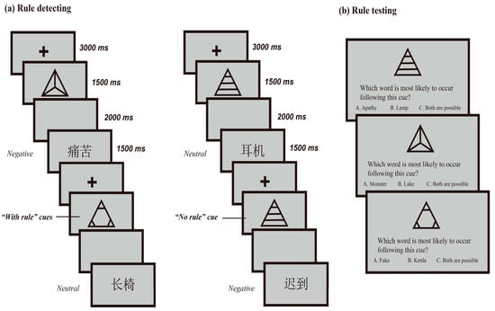 Schematic illustration of the procedures of rule learning. (a) Rule-detecting phase, where participants were instructed to view the display of cue and target words and learn the relationship between them. (b) Rule-testing phase, which was conducted to test whether the rules were fully learned. The meaning of “痛苦”, “长椅”, “耳机”, “迟到” are “pain”,” bench”,” earphone”,” late” respectively.