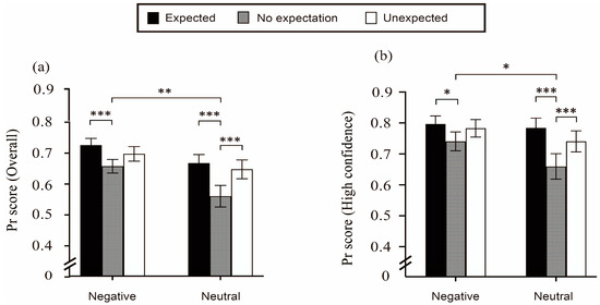 Performance in item memory task (represented by Pr scores (hit rates—false alarm rates) of the negative and neutral words in the expected, no-expectation, and unexpected conditions for (a) overall responses and (b) high-confidence responses). Bars represent the standard deviations (SDs). * p < 0.05, ** p < 0.01, *** p < 0.001.