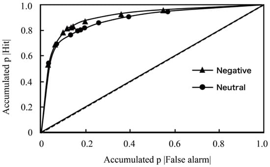 Additionally, the receiver operating characteristic (ROC) curves were obtained separately for negative and neutral words in the item memory task. The cumulative hit rates for studied words and false alarm rates for novel items were calculated for each of the 10-point confidence ratings, ranging from 1–5 for “new” and 1–5 for “old”. These ROC functions were analyzed separately for negative and neutral words. The ROC curves (in Figure 4) were constructed as in previous recognition memory research (Leynes et al. 2019; Weidemann and Kahana 2016). According to the Dual Process Signal Detection (DPSD) model, Yonelinas and Parks (2007) have suggested in their review of ROCs and recognition memory that familiarity can create curved and symmetrical ROCs, while recollection can distort the ROCs to become more linear and asymmetrical. Therefore, the curvilinear ROC curves depicted in Figure 4 for our current data may signify familiarity-based recognition for negative and neutral words, rather than recollection-based processes. However, we need to proceed with caution. Although the figure presents potential trends in the impacts of various mechanisms, the underlying mechanisms still require testing.