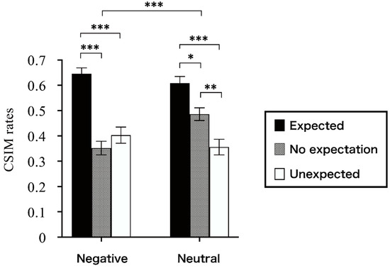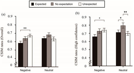 The accuracies in color retrieval were also independently calculated, and the responses with high confidence (i.e., rated 4 or 5 on the confidence scale) were analyzed. The accuracy data of source memory were also analyzed separately using a repeated-measures ANOVA, with factors of expectation (expected, no expectation, and unexpected) and stimulus emotionality (negative and neutral). The accuracies (represented by CSIM rates) for source memory tasks, including overall color retrieval, high-confidence color retrieval, and cue identification, are summarized in Table 2.