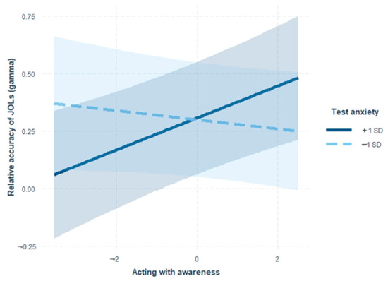 There is a scarcity of research examining the relationship between dispositional mindfulness and relative accuracy of JOLs, and potential moderators. The current study filled this important gap by showing that the interaction term for acting with awareness and test anxiety significantly predicted gamma (i.e., the relative accuracy of JOLs). Further analyses showed that for individuals with high test anxiety, acting with awareness was positively correlated with gamma; for those with low test anxiety, however, there was no statistically detectable correlation between these two variables. These findings are consistent with our a priori hypothesis.