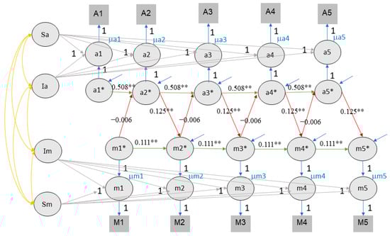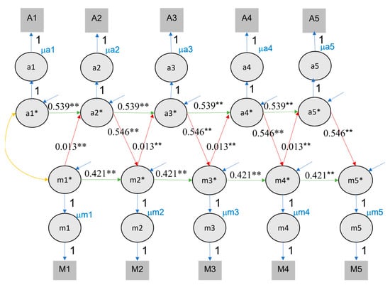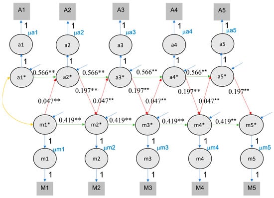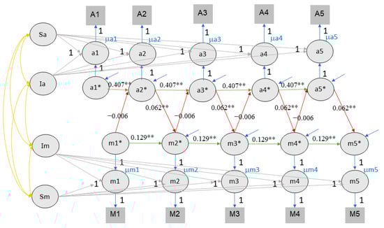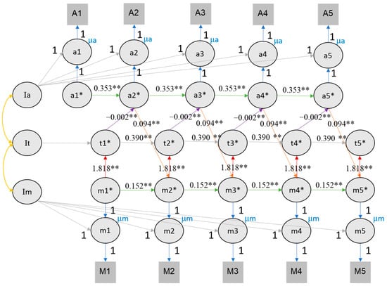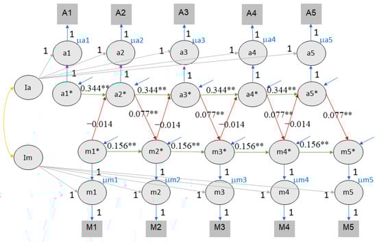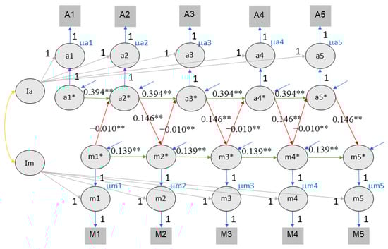 The RI-CLPM of value of education, time investment, and class rank. Note. Achievement here refers to self-rated performance in three subjects during the last semester. It is assumed that the achievement in the previous semester influences the motivation in the subsequent semester, which in turn affects the time investment in the current semester. The figures illustrate the reciprocal relationships among motivation (M/m), achievement (A/a), and time investment (t). Im, It, and Ia represent the intercepts of motivation, time investment, and achievement, respectively. Lowercase letters denote the time points from wave 1 to 5. Circles represent latent variables, while rectangles represent observed variables. The cross-lagged parameters are color coded (red, purple, and orange) to indicate different relationships, and autoregressive parameters are shown in green. The autoregressive and cross-lagged parameters are all equally constrained, hence the equal number of lines representing each parameter. The figures exclude the latent structure for error terms (e*) and associated variances and covariances for visual clarity. ** indicates that the p value of significant effects is lower than 0.01, * indicates that the p value of significant effects is lower than 0.05.