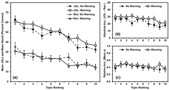 For each participant, we calculated the mean JOL for each topic ranking (Figure 2a). We analyzed JOLs using a 2 (warning vs. no warning) × 10 (topic ranking: 1 (most known) to 10 (least known)) mixed ANOVA. JOLs did not differ by warning, F(1,98) = 0.945, MSE = 2944.033, p = .333, ηp2 = .010. JOLs differed by topic ranking, F(9,882) = 33.049, MSE = 249.128, p < .001, ηp2 = .252, with a polynomial contrast indicating that JOLs were linearly related to topic ranking (p < .001). Warning and ranking did not interact, F(9,882) = 1.512, MSE = 249.128, p = .139, ηp2 = .015.