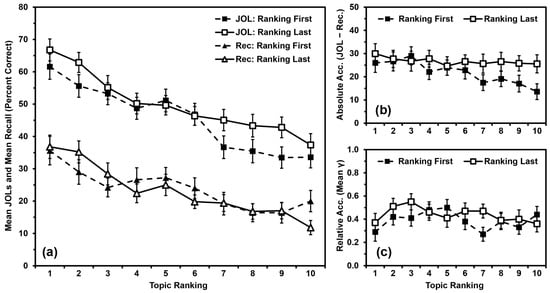 Study 1 results: (a) Mean JOLs and mean recall performance (percent correct) by topic ranking; (b) Mean absolute accuracy (JOLs minus recall) by topic ranking; (c) Mean relative accuracy (gamma correlations) by topic ranking after inputting 0 s for missing values. Error bars are one standard error of the mean.
