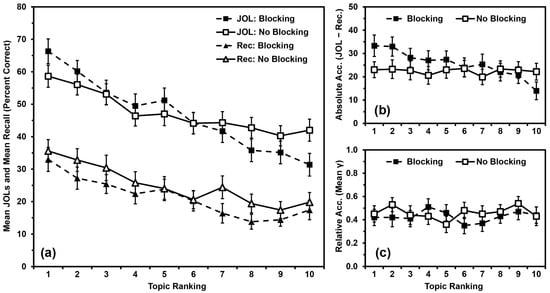 We analyzed JOLs (Figure 4a) using a 2 (blocking vs. no blocking) × 10 (topic ranking: 1 to 10) mixed ANOVA, with blocking as a between-participants independent variable and topic ranking as a within-participants quasi-independent variable. JOLs did not differ by blocking, F(1,98) = 0.019, MSE = 4158.770, p = .889, ηp2 < .001. JOLs differed by topic ranking, F(9,882) = 40.650, MSE = 187.063, p < .001, ηp2 = .293, with a polynomial contrast indicating that JOLs were linearly related to topic ranking (p < .001). Blocking and ranking interacted significantly, F(9,882) = 4.378, MSE = 187.063, p < .001, ηp2 = .043. Additionally, the linear relationship between JOLs and topic ranking varied by group (p < .001). Specifically, JOLs were linearly related to topic ranking in both groups, but the effect size was slightly larger for the Blocking Group (p < .001, ηp2 = .624) than for the No-Blocking Group (p < .001, ηp2 = .604).