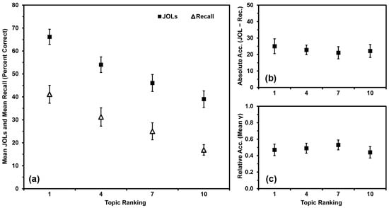 Data from (), Experiment 1: (a) Mean JOLs and mean recall performance (percent correct) by topic ranking; (b) Mean absolute accuracy (JOLs minus recall) by topic ranking; (c) Mean relative accuracy (gamma correlations) by topic ranking after inputting 0 s for missing values. Error bars are one standard error of the mean.