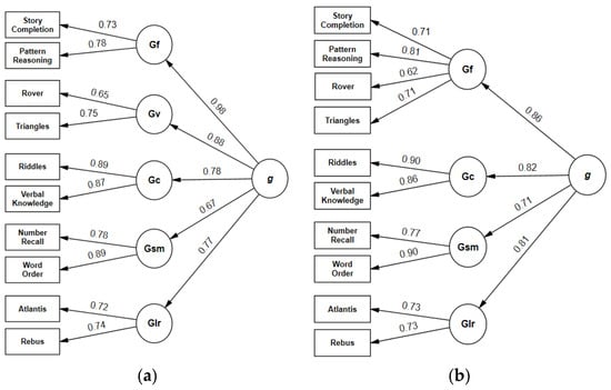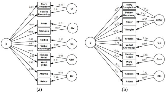 | 3 | bifactor | g, Gf | g, Gf | g, Gv | g, Gv | g, Gc | g, Gc | g, Gsm | g, Gsm | g, Glr | g, Glr |