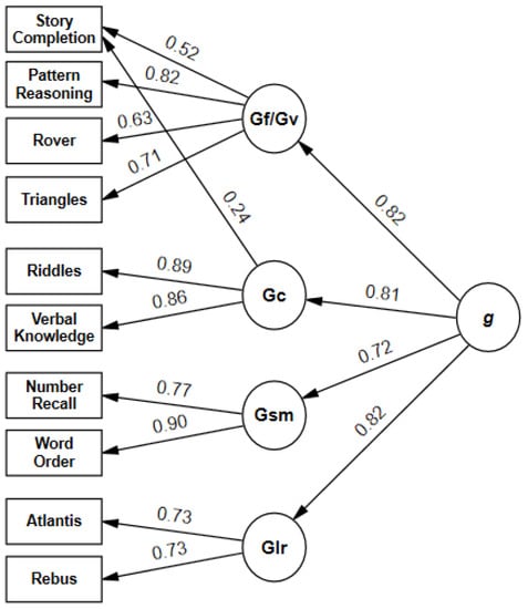 Renner, G.; Schroeder, A.; Irblich, D. Factorial Validity of the German KABC-II at Ages 7 to 12 in a Clinical Sample: Four Factors Fit Better than Five. J. Intell. 2023, 11, 148. https://doi.org/10.3390/jintelligence11070148