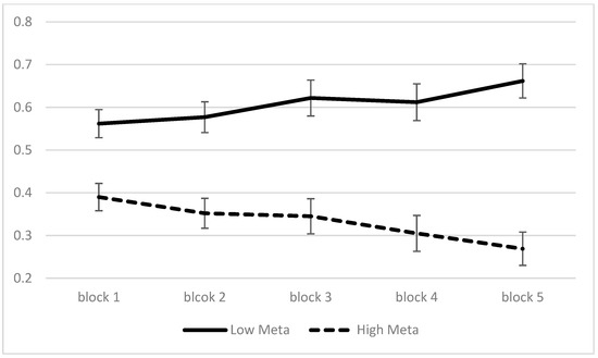 To observe whether metacognitive awareness was appropriately measured by the IGT, we used a 2 × 5 factorial ANOVA where the first variable was metacognitive awareness as a between-subjects factor and block as a within-subject factor. The median for the metacognitive awareness was used to divide participants into two groups: “Low Meta” () versus “High Meta” (). Block was divided into five sections of 20 trials each, sequentially, for the IGT.