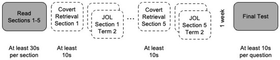 The experiment consisted of a study phase and a test phase two days later (Figure 1). Participants were randomly assigned to one of four experimental groups based on a 2 (covert retrieval instruction: yes vs. no) × 2 (delayed JOLs: yes vs. no) factorial design. During the study phase, participants read each of the five titled sections, one at a time, in a fixed order. Participants had to spend at least 30 s reading each section. The study phase ended for participants in the no retrieval + no JOL group or continued with covert retrieval practice, JOLs, or both, for participants in the remaining groups.