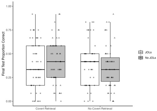 Given the hypothesized benefits of prior covert retrieval instructions and making metacognitive judgments, we predicted that engaging in covert retrieval and providing delayed JOLs would produce better text comprehension than reading alone. Contrary to this prediction, a one-sided t-test revealed no significant difference in final test performance between participants in the retrieval + JOL condition and the no retrieval + no JOL condition, t(105) = 0.60, p = .28, d = 0.12. The Bayesian analyses also suggested that covert retrieval prior to making JOLs does not enhance learning beyond reading alone, BF0+ = 3.89, posterior median = 0.10, 95% HCI = [−0.25, 0.46]. Thus, we found no evidence for JOL reactivity even when participants who made JOLs were encouraged to thoroughly retrieve first.