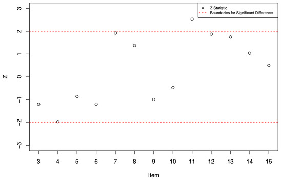 Due to some constant response patterns within subgroups (all items were either correct or incorrect within one or both groups), Items 1 and 2 were excluded from the DIF analysis. Table 5 presents the item difficulty estimates and standard errors specific to each subgroup, z statistics, and p values. Subgroup 1 represents the focal group of children and subgroup 2 the group of undergraduate students. According to the results, the most difficult item for subgroup 1 compared to subgroup 2 was Item 11 (z = 2.53, p < .05), followed by Item 7 (z = 1.92, p = .05), and the easiest item for subgroup 1 compared to subgroup 2 was Item 4 (z = −1.96, p = .05). The remaining items were not significantly different in their difficulty between subgroups. Nevertheless, there were both positive and negative z statistics, indicating that some items were easier for subgroup 1 whereas others were easier for subgroup 2. The z statistics for Items 3 to 15 are also presented in a plot in Figure 2. Specifically, the x-axis presents the items and the y-axis the z statistics. Dashed horizontal lines at +2 and −2 demarcate statistically significant deviance in item difficulty between subgroups.