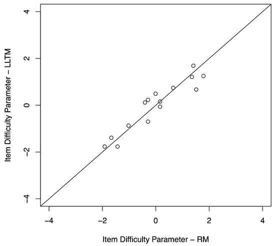 The model fit analyses for the LLTM yielded somewhat divergent results. Specifically, the −2log-likelihood statistics were equal to 1137.751 for the dichotomous Rasch model and 1191.925 for the LLTM, with a difference in −2log-likelihoods of 54.174. The difference in the degrees of freedom between the two models was 5. The 0.95 quantile () of the distribution with was 11.0705. The −2log-likelihood difference was greater than 11.0705, indicating that the dichotomous Rasch model had a better fit than the LLTM, and the specified item characteristics in the LLTM did not capture all variation in item difficulty in the dichotomous Rasch model. This result was consistent with previous studies that have used the likelihood ratio test to compare the LLTM and standard Rasch models (Alexandrowicz 2011; Baghaei and Hohensinn 2017; Baghaei and Ravand 2015; Cao et al. 2014; Fischer 2005; Fischer and Formann 1982), even when the Q-matrix was well constructed and item characteristics accounted for most of the variance in item difficulty Rijmen and de Boeck (2002). The LLTM assumes that the variance of item difficulty is completely accounted for by item characteristics (Cao et al. 2014), which may explain why the likelihood ratio test result is always significant. Nevertheless, despite the rejection of the likelihood ratio test between the Rasch model and the LLTM, the correlation coefficient between the difficulty parameters of the two models was strong and positive (), indicating that approximately 88.36% of the variance in overall item difficulty could be accounted for by the nine spatial characteristics. Illustrating this correspondence, Figure 3 shows a scatterplot of the LLTM item difficulty parameters and the item difficulty parameters from the dichotomous Rasch model. Item estimates are generally located along the diagonal, indicating concurrence between the models. The alignment in the item location estimates between these two models reflects the degree to which the item characteristics in the LLTM accurately reflected the difficulty of the items. In other words, the correspondence between item estimates from the Rasch model and the LLTM suggests that the spatial characteristics from the LLTM meaningfully contributed to item difficulty. Together, these results suggest that the item characteristics provide useful information about differences in item difficulty in the context of the OA assessment.