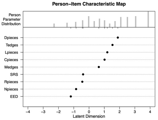 In summary, Figure 4 presents the respondents and item characteristics distributed on a scale that reflects their ability (for respondents) and difficulty (for item characteristics). The histogram at the top displays the frequency of respondents falling within certain ability levels. On the left, each characteristic is plotted to show where it lies in terms of difficulty. Despite the wide range of participant abilities, the item characteristics seem to be suitably challenging for our target population.